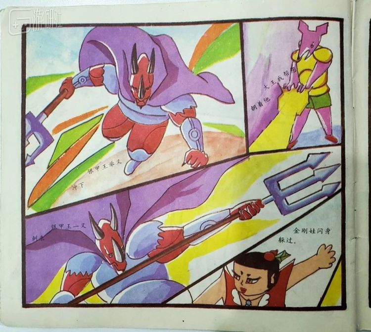 内蒙古少年儿童出版社的《葫芦娃大王:金刚娃遇险》中,反派银甲王举叉冲下时,颇有气势,漫画分镜也与那些一个个四方格子的不同,很明显用了心: