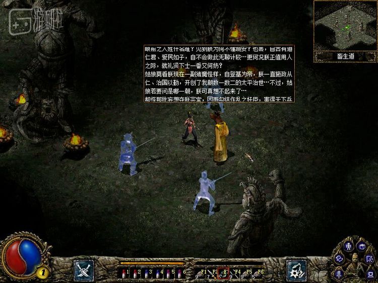 在畜生道有一个黄袍加身但顶着个猪脑袋的皇帝,被三五个卫兵护着,说自己还在世时,也是个开创了太平盛世的仁君,都怪隔壁的恶鬼道里的奸臣造反作乱,毁了他的大好河山。就算沦落到地狱还总想杀他。去隔壁一看,有个鬼面将军,见面就骂畜生道那个狗皇帝、猪脑袋,是个贪图美色的昏君,搞得天下民不聊生。要不是狗皇帝的昏,哪有他的乱。