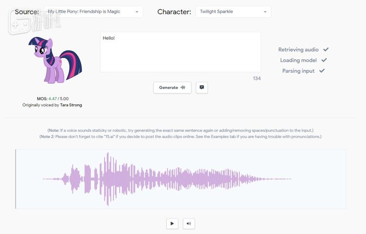 其中,两个小马的配音质量是最让人震撼的,外网网友们普遍觉得这个AI已经十分接近动画里的语气和感觉了。当然这两个角色使用的训练素材也是最多的,除了全部的9季动画,据说还“通过各种手段”拿到了无背景音的配音原声。用这个AI生成的语音自制粉丝剧情,代入感肯定十足。