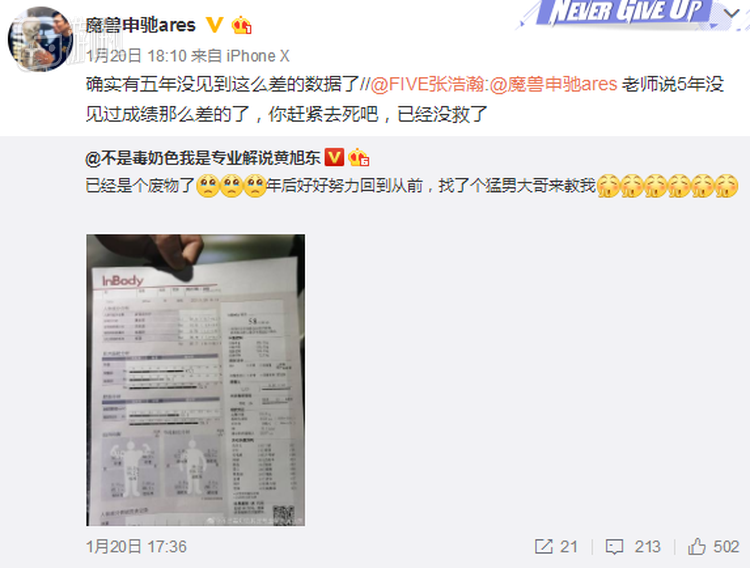 春节前,黄旭东来到申驰的健身馆做了体侧,满分120分,他只拿到了58分,在微博晒出测试成绩时,黄旭东吐槽说自己“已经是个废物”。申驰说他已经有五年没看到过这样的数据,“正常情况下低于80分就建议改善身体,以他目前的年纪和数据来看,身体已经非常糟糕。”