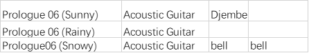 这是《动森》音乐的一大特色:充满变化的天气系统。它们的配器和主题曲《Title Theme》一致,电声乐器较少。曲风以Blues、Jazz、Old Rock、R&B等为主。从题目就可以看出,游戏中的晴天、雨天、雪天,音乐会发生变化。经过仔细分析和对比,非常明显的变化是乐器增减,比如以Prologue 06系列为例: