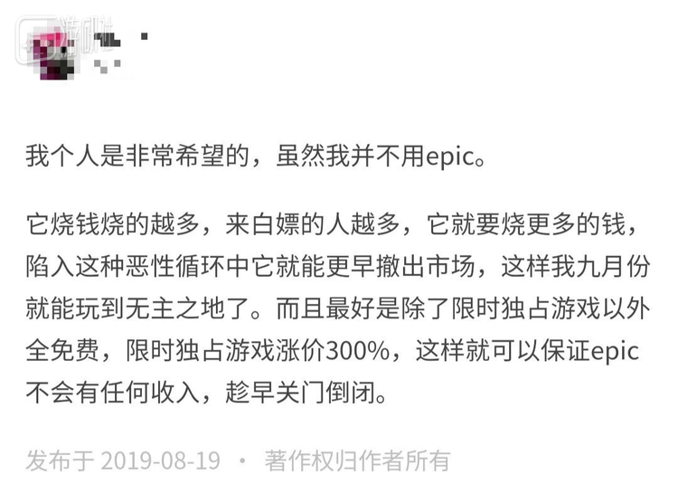 厂商之外,玩家或许会有另一个疑问,这种限免是否可持续,如果可持续下去,又是不是对行业有益?在网上,有一种观点并不少见,觉得Epic这是在烧钱,白嫖玩家越多,Epic烧钱越多,必将陷入恶性循环。