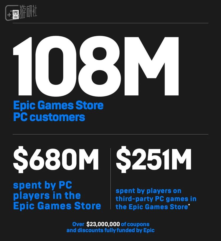 在今年年初,Epic统计了商城数据。上线一年,商城已有1.08亿用户,所有用户在Epic商城中总计消费了6.8亿美元。抛开Epic自家游戏外,第三方游戏的销售额是是2.51亿。与此同时,商城为用户提供了2300万美元的优惠和补贴。