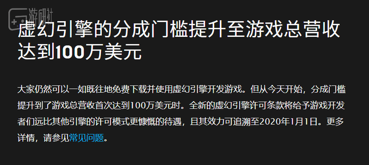 随着新引擎的公布,Epic更新了一个政策,鼓励开发商使用虚幻引擎:在游戏收入突破百万美元前免版税。