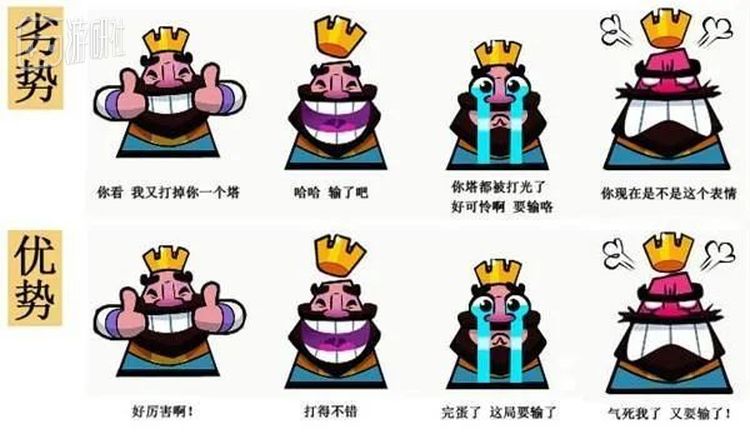 同样的故事发生在Supercell自家的《皇室战争》中。游戏里内置的表情,在对手的劣势局使用,或其优势局使用,能起到相反的效果。