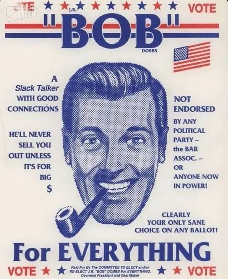 小册子宣称,“亚天才教会”的创始人名叫J.R “Bob” Dobbs(当然是伊万和费洛创作的虚构角色),简称“Bob”。Bob是一个金牌电钻销售员 ,有一天在看电视的时候得到了神启,意识到邪神“耶和华1号”在巧取豪夺“摸鱼能量”,从此开始了自己的反抗历程。他吊着烟斗的肖像,成为了“亚天才教会”的象征。