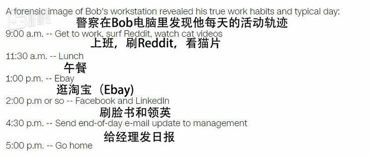 但是Bob有个多年不为人知秘密:他平时其实一行代码也不写,每天坐在电脑前面,他就刷刷网页,看看猫片,熬到下午四点半,给经理发封日报回家。