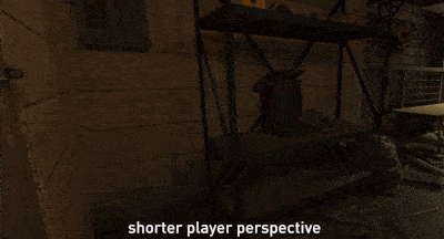 《半衰期:爱莉克斯》中,玩家可以让游戏重新检测身高,根据得到的数据调整视角的高度。Buffet则利用了这个设计,在游戏检测身高的时候先趴在地上,让VR头盔尽可能贴近地面,然后在关卡加载完毕之后站起来,这样在游戏看起来玩家就变成了巨人,头部的高度超出了货箱,这样游戏开始时Buffet就不是在货车里面醒来,而是在货车上面。