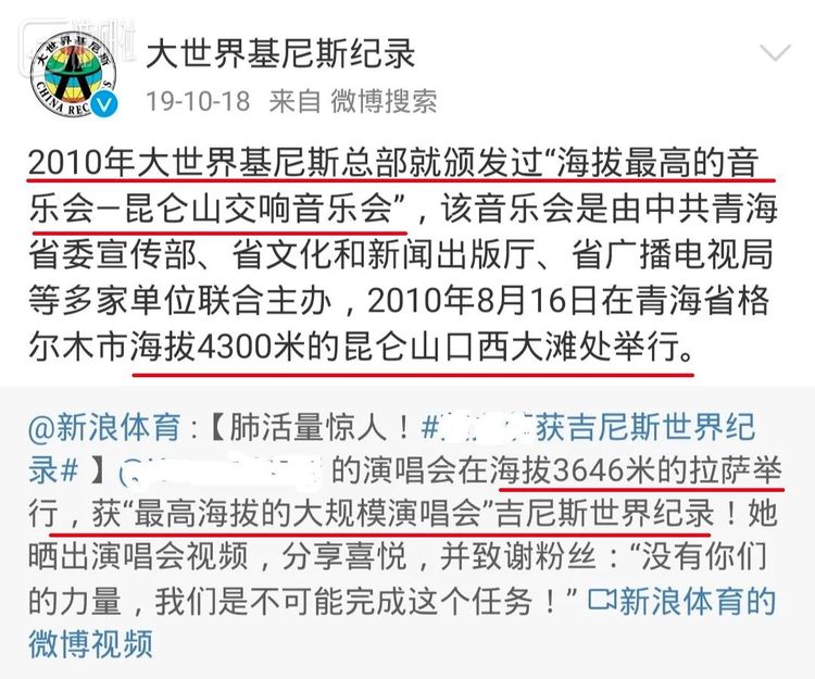 基尼斯官方微博指出自己早在2010年便颁布过“海拔最高的音乐会——昆仑山交响音乐会”的世界纪录,音乐会人数同样不少,举行于海拔4300米的昆仑山口西大滩处。