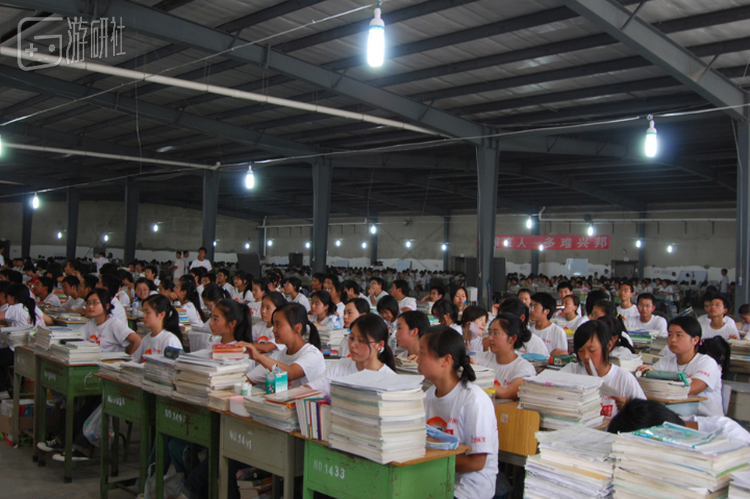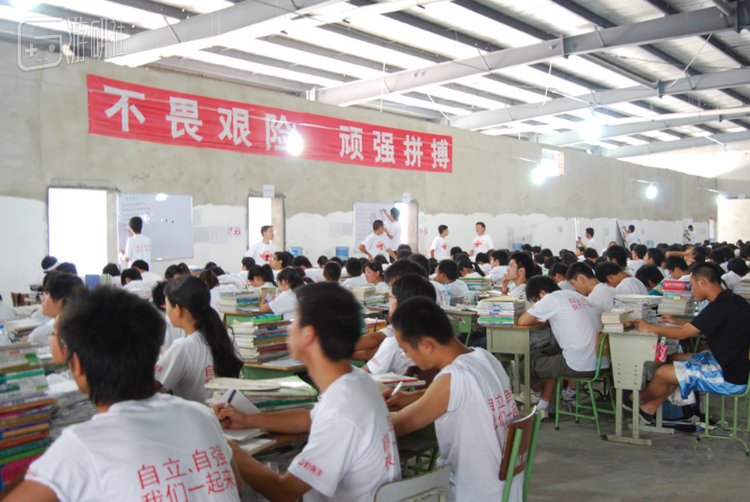 2008年5.12的地震,震垮了四川省安县中学和秀水中学高三学子的校舍。为了备战高考,学生们统一在面积为17600平方米的开放式灰色厂房里学习。