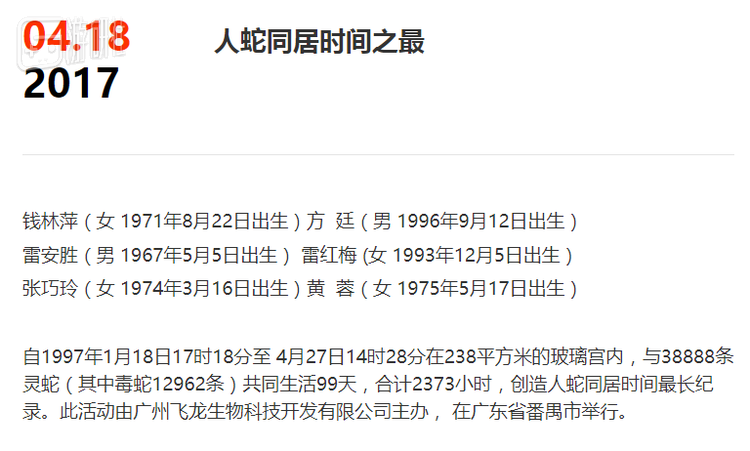 1997年,广东4位年仅二三十岁的年轻男女,1位1岁的婴儿和1个4岁的小女孩,因为和38888条灵蛇,其中12962条毒蛇,共同在238平方米的玻璃宫中生活了99天,创造了人蛇同居的时间最长的纪录。