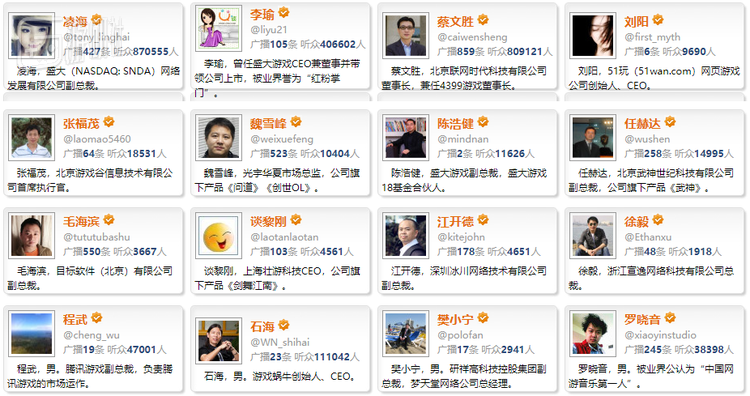 他们以游戏厂商的高管和市场、运营人员,游戏媒体编辑为主,也有一些游戏相关的网络红人。
