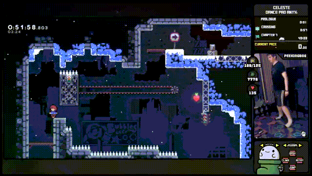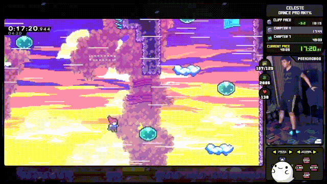 这位想要用跳舞毯来速通的玩家名叫PeekingBoo,一名十分擅长用跳舞毯来打游戏的玩家。在挑战速通C面之前,他已经成功用跳舞毯速通过《蔚蓝》、《超级马力欧64》和《超级马力欧 奥德赛》。在最新的视频里,PeekingBoo刚刚刷新了自己蔚蓝A面速通的全流程记录——当然也是用跳舞毯。