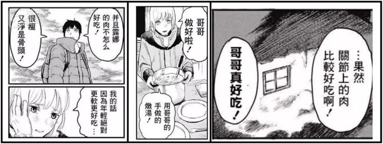 在一开始,同样有再生能力的妹妹就砍下哥哥的手臂,分给全村人吃肉,十分干脆地把观众拉入残酷离奇的世界观里,还一并缔造了“哥哥真好吃”的名场面。