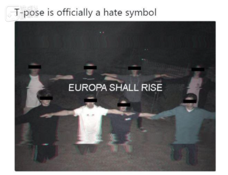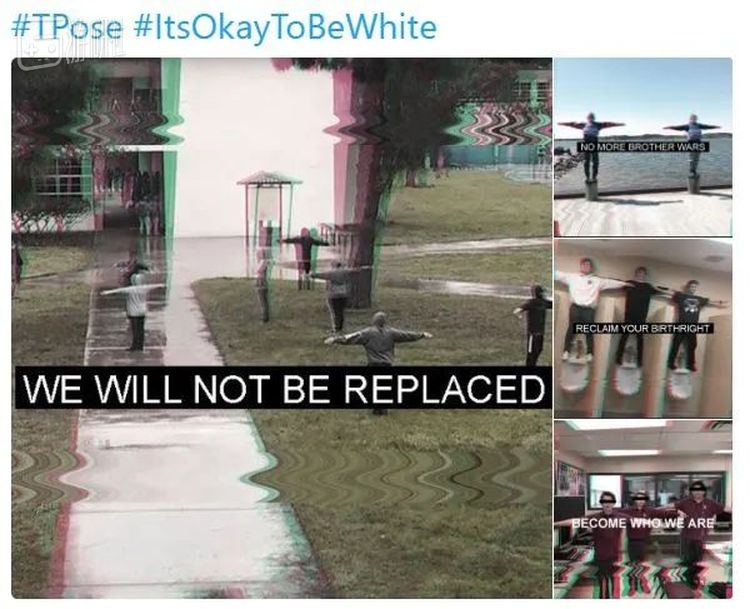 在T pose成为人人争相模仿的无意义模因时,有人开始宣扬“T pose是仇恨的象征”,配上摆着T pose男孩子们的图片。图片中的人被打上了马赛克,还印上了会激起冲突的发言来试图借这阵热度煽动种族主义。
