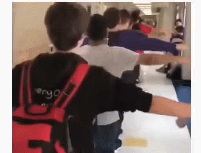这群孩子煞有介事地举着双臂,按照顺序从厕所中走出,全程不看镜头,仿佛在举行一场邪教仪式。他们就这样举着双臂,从学校的走廊里穿过,好像在举行一场无声的游行。