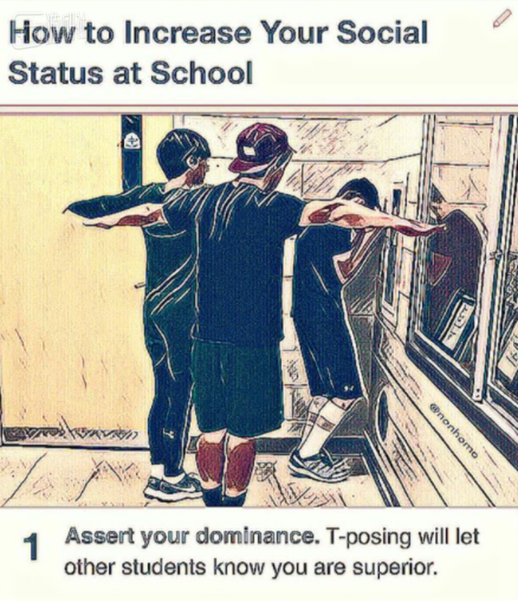 当然,除了玩梗之外,这个迷惑行为并不具有任何别的意义,但自从这个视频在Youtube上开始传播,越来越多的人开始在现实生活中摆起了T pose。甚至还有新闻就“如何提升在学校中的地位”展开了讨论,第一条便是:摆出T pose能够让其他学生们知道你是个强者。