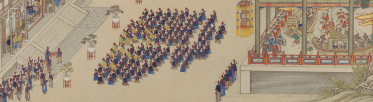 《平定台湾战图•清音阁演戏图》描绘了乾隆平定台湾林爽文起义后的庆功戏曲演出