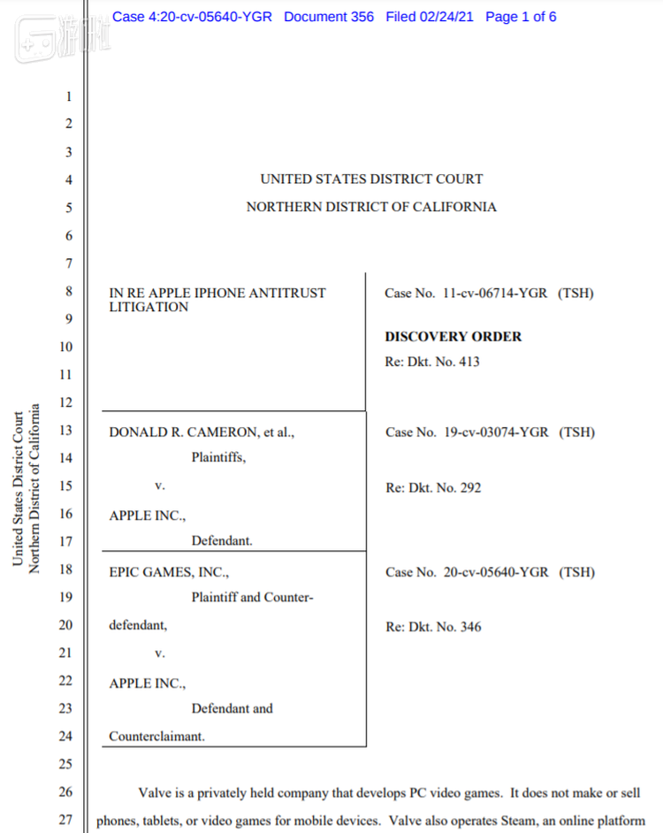 但最近释出的一份该案的法律文件打破了这份沉闷——该文件显示,Steam的实际运营公司Valve被牵扯进了这场官司,苹果公司要求其在3月8日之前提供Steam平台上自2015年以来超过三万款游戏的数据,其中包括这些游戏的基本信息、销售数据、年度收入以及收入构成,此外还要求Valve提供Steam的营收信息。