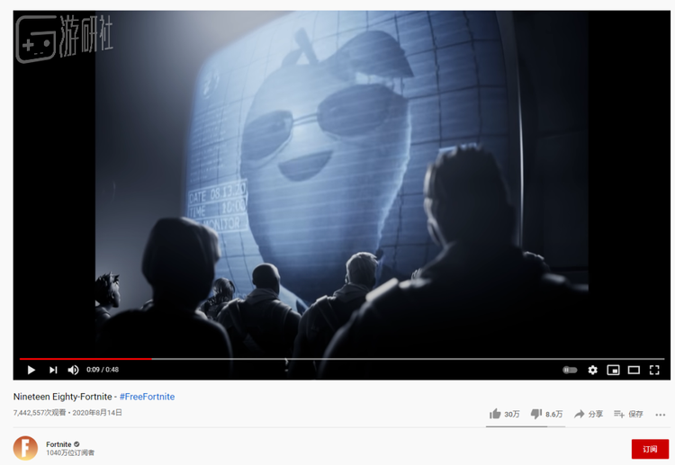 在应用被苹果下架后,Epic立刻释出了一则名为《Nineteen Eighty-Fortnite》的视频。这支视频的结构几乎原样复刻了苹果在1984年制作的首支Mac电脑广告。不同的是当年代表反抗者的苹果坐到了“老大哥”的位置上,换成了《堡垒之夜》的角色来推翻其统治。