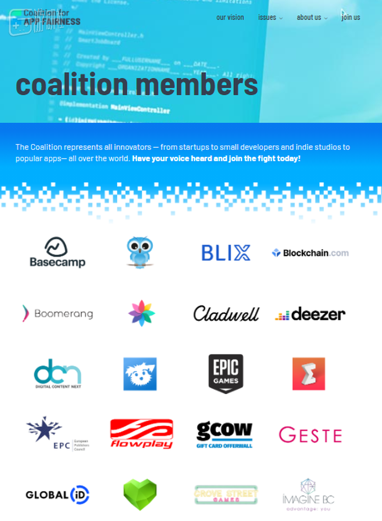 除了自身与苹果之间的对垒,Epic还积极参与了“应用公平联盟”(Coalition for App Fairness)的活动。