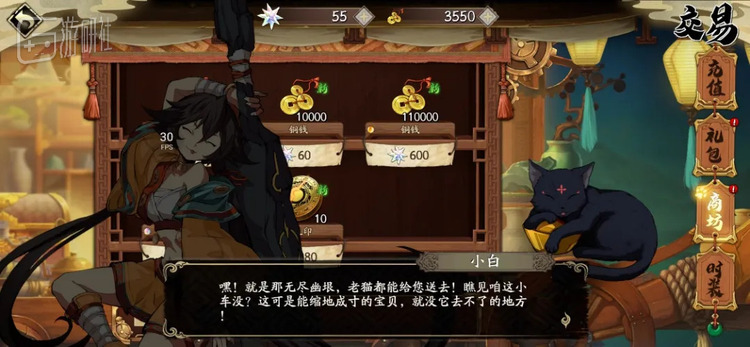 就拿这类游戏中常见的“商店”来说。绝大多数的推图游戏里,由于缺乏一个连贯的场景空间,无法提供更具实体感的“NPC商人”,商店功能往往表现为主界面的一个“商店”按钮。对于这类司空见惯的设定,极少有游戏会做出解释,玩家也没有要求解释的需求。但在《天地劫》中,主角先是偶遇推着小货车的老猫,在攀谈中,除了交代了小货车是由迦夏之窟的特殊道具打造(与单机前作有关),还用对话传递了几个信息: