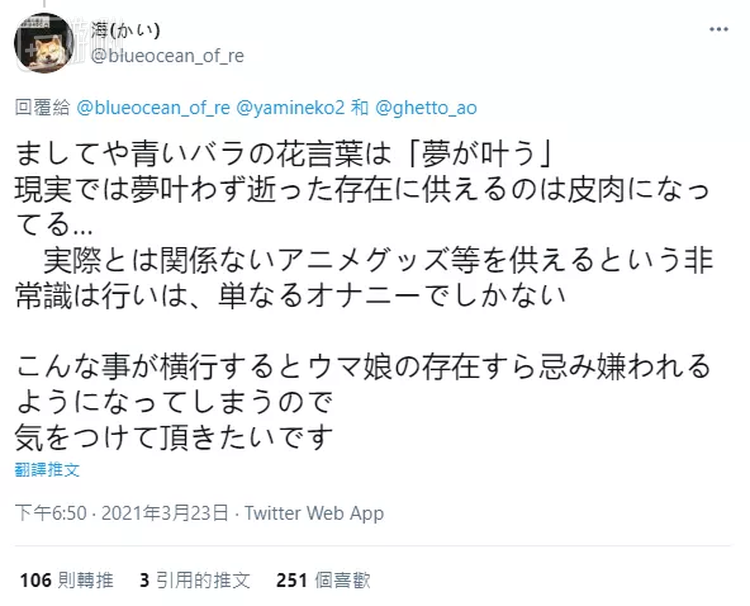照片中,米浴的墓前除了鲜花与胡萝卜以外,还出现了许多以往祭拜中不是那么常见的东西。比如赛马娘中米浴头上带着的蓝色蔷薇,就被ACG爱好者们作为祭品放在米浴墓前。
