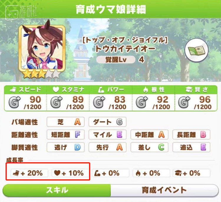 比如在角色设定上,东海帝皇拥有速度和耐力两项加成,是非常典型的中程马。