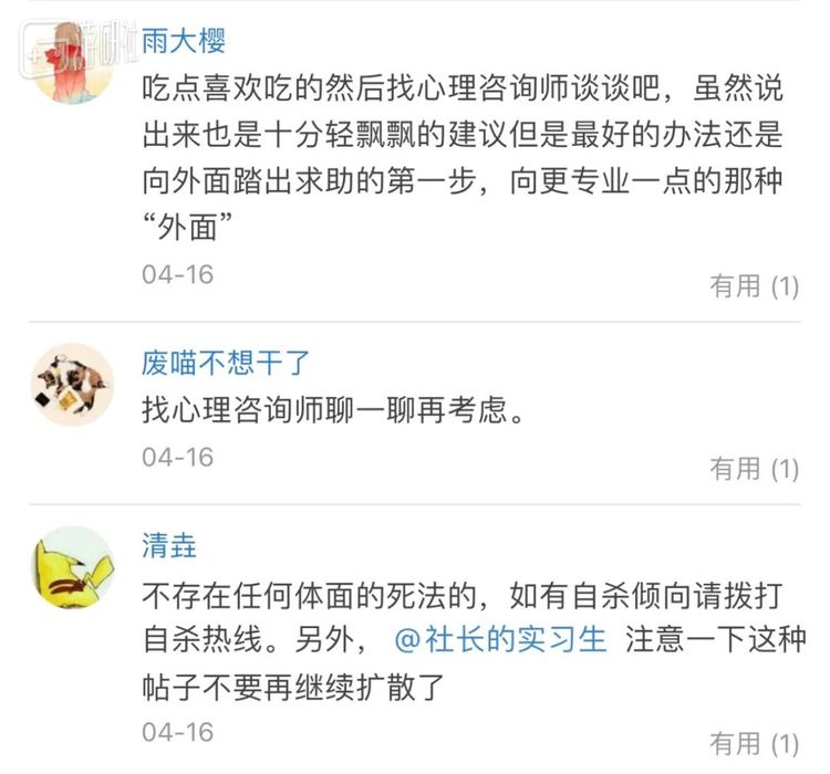 后来那个关于“如何体面离去”的问题下,反应相对平静。个别不当发言立刻受到了驳斥,没有过度煽情,没有乐子人,也没有发展到什么需要我们介入的方向上去。