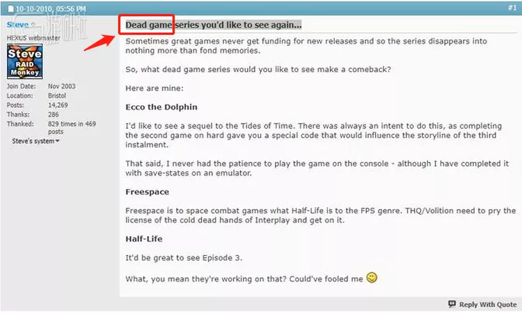 根据海外梗百科网站knowyourmeme记载,dead game这个词网络上最早被发现是在2010年10月10日。当时有位名叫Steve的用户在论坛上发帖,主题是“如果让一些凉掉的游戏系列复活,你的选择会是什么”。