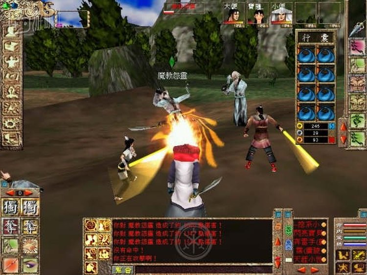 2000年,昱泉国际推出了以3D技术制作的《笑傲江湖日月神教》,并获得成功,销量突破50万套。3D视角带来了全新的临场感,战斗框架是回合制,但加入了连招设定,一个招式结束时按下对应招式就可以打出连技,观感十分流畅。此外,全语音过场动画,平凡淑芬绘制的角色概念图,都曾让玩家印象深刻,美中不足的就是制作组对原著情节的取舍有些问题,使得剧本衔接不够顺畅。