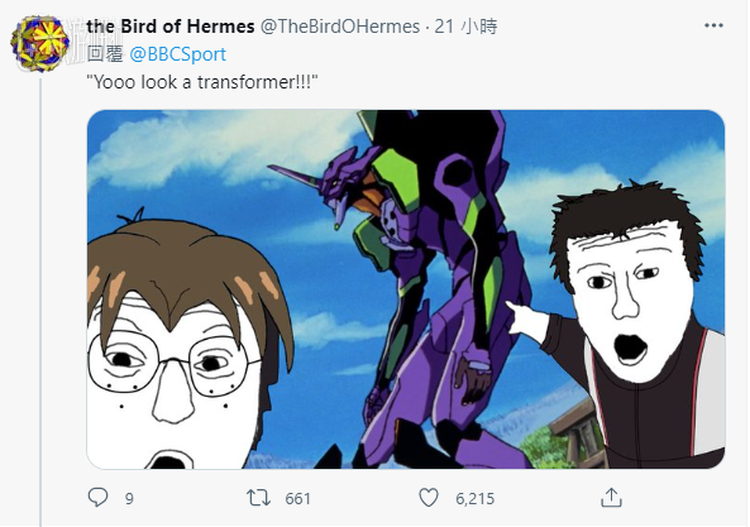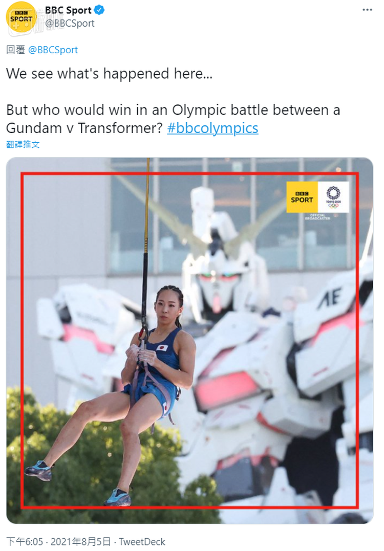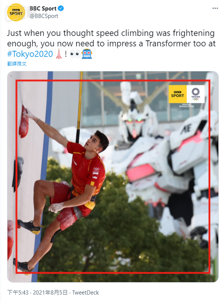 8月5日,BBC体育官推发布了一条关于攀岩速度赛金牌选手、西班牙19岁小将阿尔贝托·吉内斯·洛佩斯的推文。配图中独角兽高达再度出现,而这次更加离谱的是,BBC直接在文案中将“独角兽高达”错认成了“变形金刚(Transformer)”