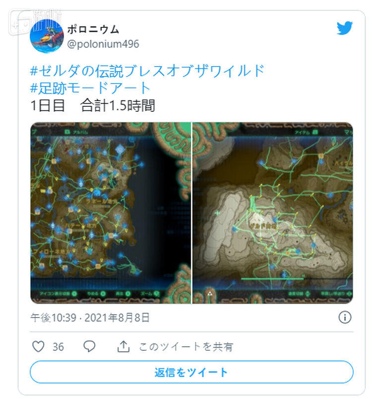 而最近,一位叫作ポロニウム(twitter @polonium496)的玩家甚至在这一亩三分地上秀起了针线活——经过41天的努力,他最终成功将《塞尔达传说》系列的LOGO还原到了海拉鲁大陆的地图上。