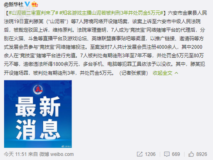 负责审理本案的安徽省六安市金寨县人民法院彼时一审以开设赌场罪判处了Shinnyruo三年有期徒刑,缓刑三年,结果判决结束后被告方裁定选择了上诉,直到今天,案子二审宣判的消息才被新华社曝了出来。