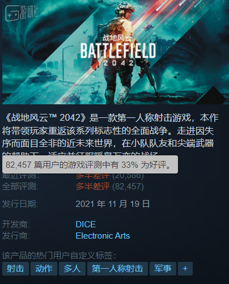 售价60美元的《2042》斩获了5万差评数,比免费的《eFootball 2022》总评价数还多,从某种角度而言也算是赢了