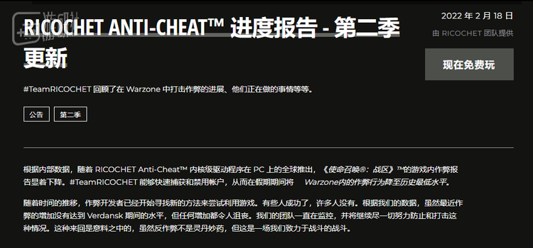 今年的2月18日,《使命召唤:战区》的官方博客更新了一篇反作弊进度报告。报告写道,“根据内部数据”,RICOCHET反作弊程序的推出使得游戏内的作弊举报显著下降,“《战区》的作弊行为已经跌至历史最低水平”。