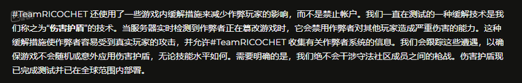 这项措施被称作“伤害护盾”(Damage Shield)。当服务器实时检测到作弊者使用了某种篡改游戏数据的手段,伤害护盾就会开启,“禁用作弊者对其他玩家造成严重伤害的能力”。简单来说,伤害护盾会大幅削弱作弊者的枪械伤害,令作弊者无从伤害或击杀正常玩家,相当于一种正常玩家的“内挂”。