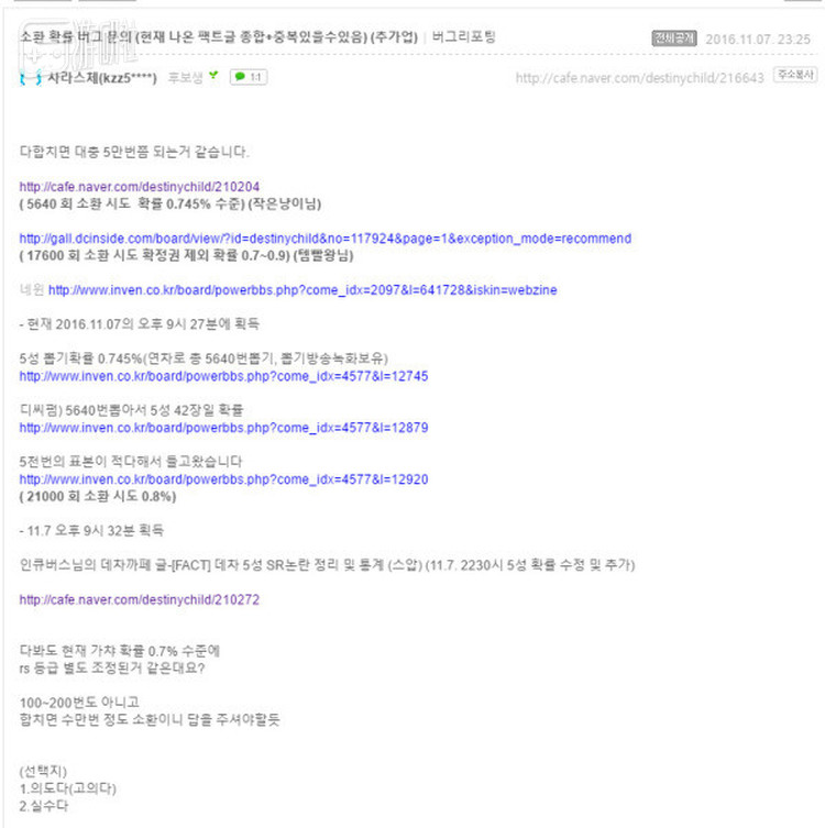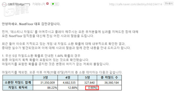 官方宣称五星角色的出现率为1.44%,但有一名韩国大R玩家在花费了数百万韩元之后,得出了一个令人比较气愤的结论:11月9日之前游戏内五星卡的实际掉率只有0.9%。该玩家将该结果连同相关证据递交给了运营方Next Floor。