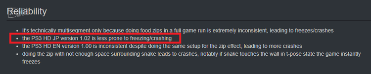 《合金装备3》速通社区最常用的游戏版本,是2011年在PS3和Xbox 360上发售的《合金装备HD合集》。Apel一直在模拟器上运行PS3的英文版本,至于其他版本能否触发BUG,仍待进一步测试。