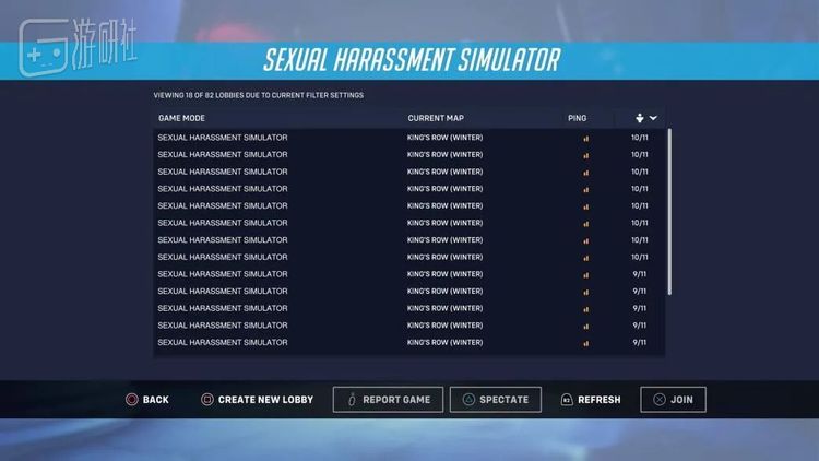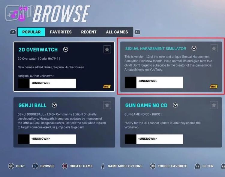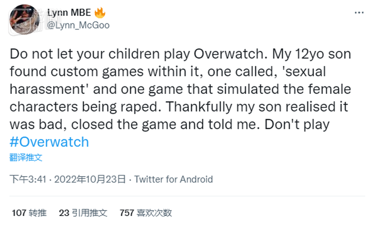 10月23日,一位网名叫做Lynn MBE的Instagram博主在推特上反馈,他的12岁儿子在《守望先锋2》中碰到了成人内容。“不要让你的孩子玩《守望先锋》。我12岁的儿子在里面找自定义游戏,其中一个叫‘性骚扰模拟器’,另一个则是模拟被强奸的女性角色。”