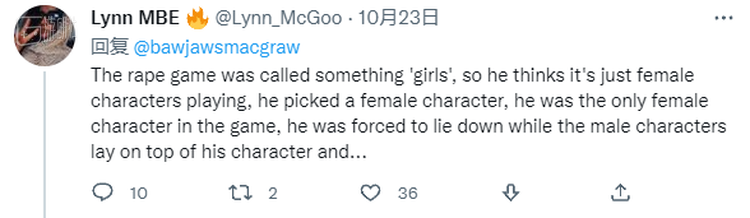 尤其是第二种服务器。服务器的房间标题带有“女孩”(girls),Lynn的儿子便认为这是一个仅允许使用女性角色的服务器。可是选了女性角色之后,他发现自己是服务器中唯一的女性角色。“他被迫躺下,而男性角色纷纷躺在他的身上,然后……”Lynn没有再说下去。
