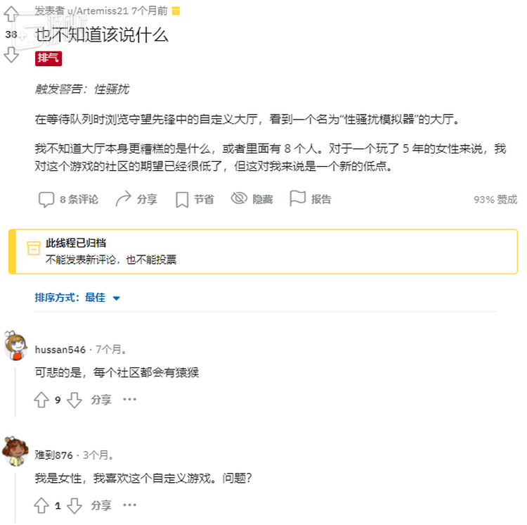 在Lynn与Limmy之前,也有少数玩家发现“性骚扰模拟器”或类似的色情内容后,在推特、Reddit,或者暴雪官方论坛公开表达不满。