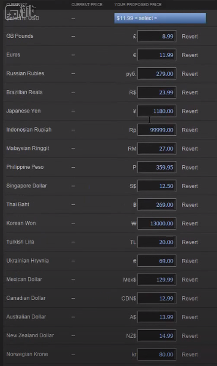 在开发者的游戏定价界面上,Suggest Pricing(推荐定价)的标签就是这项工具的入口,只要开发者输入了其定价的美元价格,剩下的货币就会按照当地购买力和当前汇率的评估自动生成,对于开发者来说,实际上是个相当便利的工具。