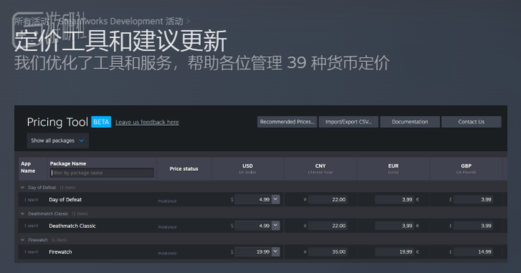 就在昨天,V社在自己的开发者平台Steamworks上发布了一项新的开发者定价工具,帮助开发者们能在不同区服依靠汇率来灵活定价,以免出现定价差别过大,或是错误操作出现定价过低的情况。