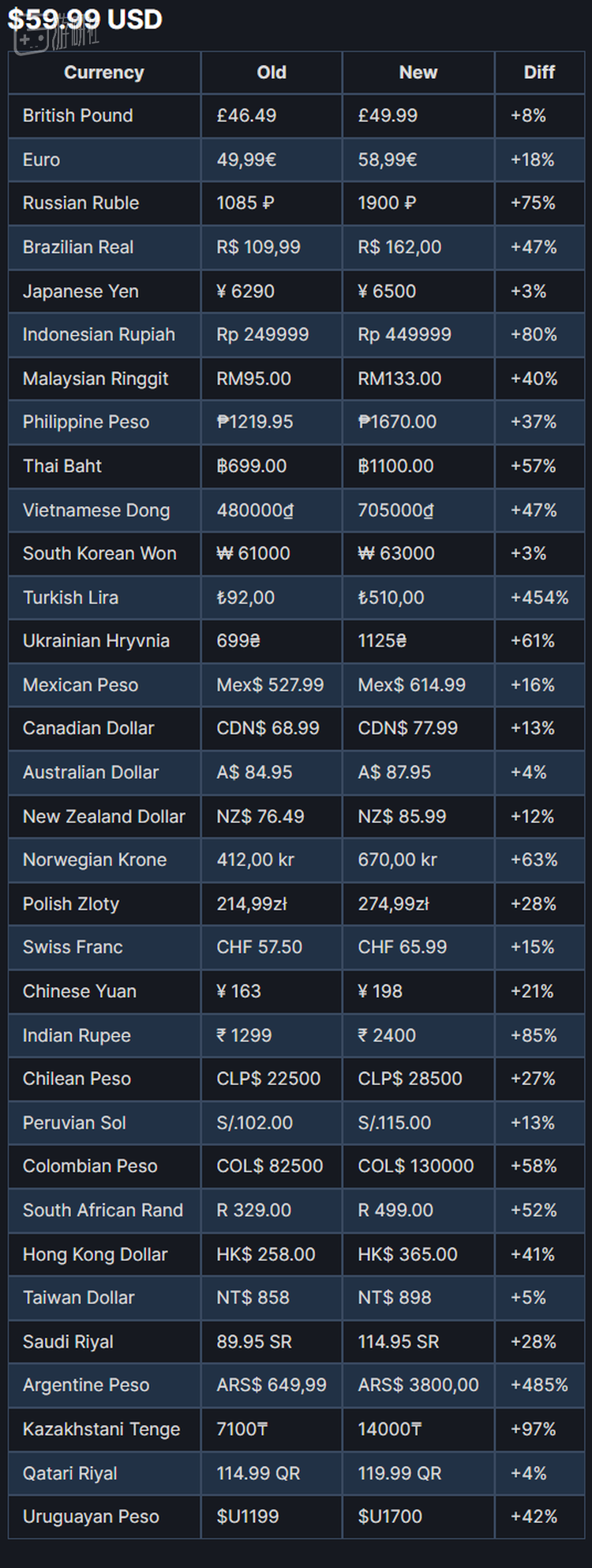 这项定价工具整合了当前Steam市场上39种不同货币,相比目前的价格涨幅也相当残酷。譬如一款售价为60美元的游戏,现在人民币的价格为198元(此前为163元)、中国香港地区为365港币(此前为258港币),阿根廷区则涨到了3800披索,相较于原来的649.99披索增长了485%。