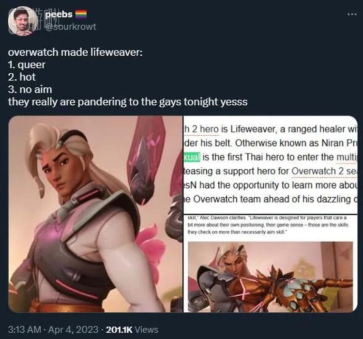 紧跟着他的观点,不少人也指出他们并不觉得新英雄身材火辣。精致的妆容,鲜艳的发色,以及开襟的衣服,再加上他泰国人的身份,都是外界对刻板印象的堆叠,同样是《守望先锋》把泛性恋当做作标签粗暴使用的证明。
