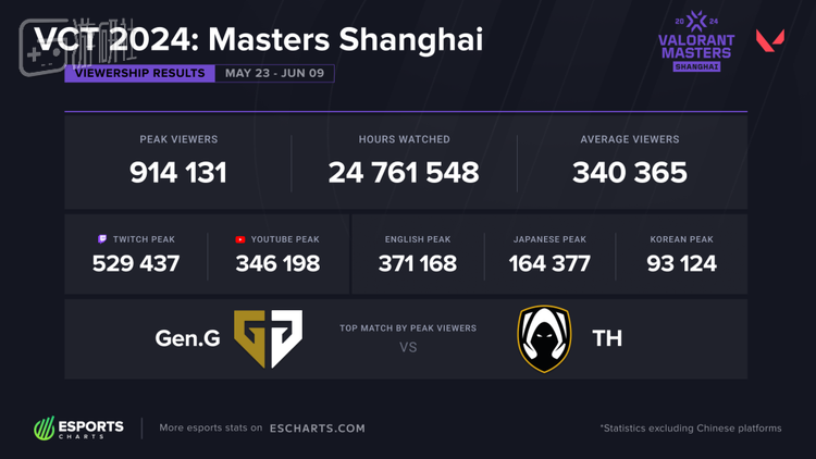 上海大师赛的场外数据也相当不错。开赛以来,“#无畏契约上海大师赛#”超话取得了1.7亿阅读量和9万次讨论量。另据海外电竞数据网站EsportCharts统计(不计入中国地区直播数据),上海大师赛的平均观看人数为34.04万人,Gen.G和TH的巅峰对决,达到了91.4万观众的峰值。
