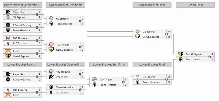 在最终的BO5总决赛中,太平洋赛区二号种子队伍Gen.G,以3:2的比分战胜了美洲赛区二号种子队Team Heretics,捧走了上海大师赛的冠军奖杯,同时夺得了属于他们的首个国际赛冠军、这也是VCT太平洋赛区的首个国际赛冠军。