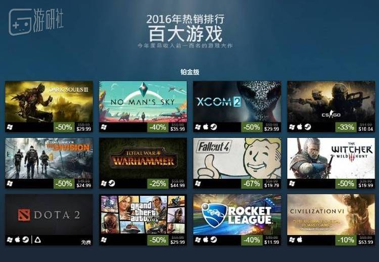 Steam公布了2016年总收入TOP100的游戏名单,该榜单按收入分铂金、黄金、白银、青铜四个等级,同一等级的排名不分先后。我们注意到,在收入最高的铂金级中,除了《全境封锁》在发售前期爆出过各种问题(后期再一次次的更新中逐渐改良了游戏体验),其余都是叫好又叫座的优秀作品——
