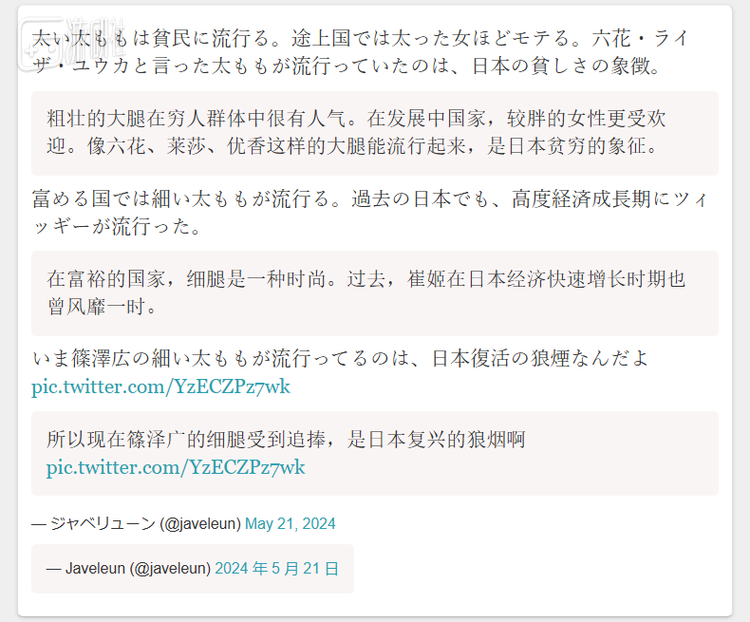 考虑到实验参与者人数有限,上述结论显然过于武断,不过在日本互联网上,类似的论调确实存在一定受众。比方说去年《学园偶像大师》上线之初,体态孱弱的篠泽广曾因过度夸张的“筷子腿”风靡一时。当时也有网友提到了肉腿与经济形势之间的关系,认为篠泽广的高人气是日本经济复苏的积极信号——当然,这话其实玩笑成分居多。